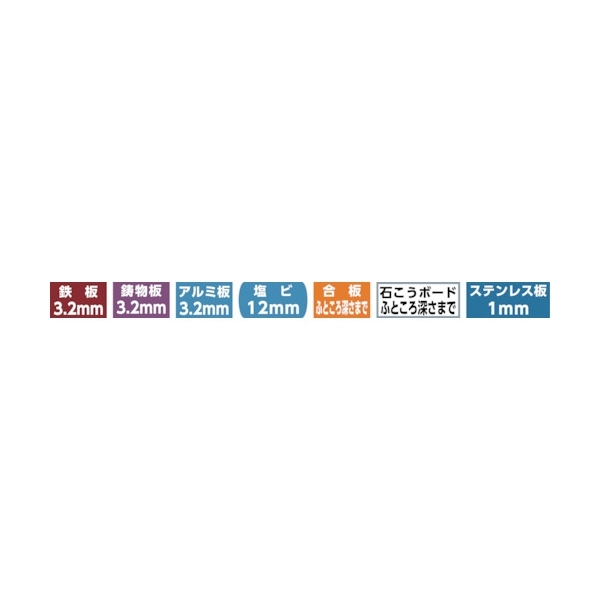・被削材:鉄板、アルミ、鋳物、合板、石こうボード、塩ビ、鉄板(3.2mm)、ステンレス(1.0mm)など。