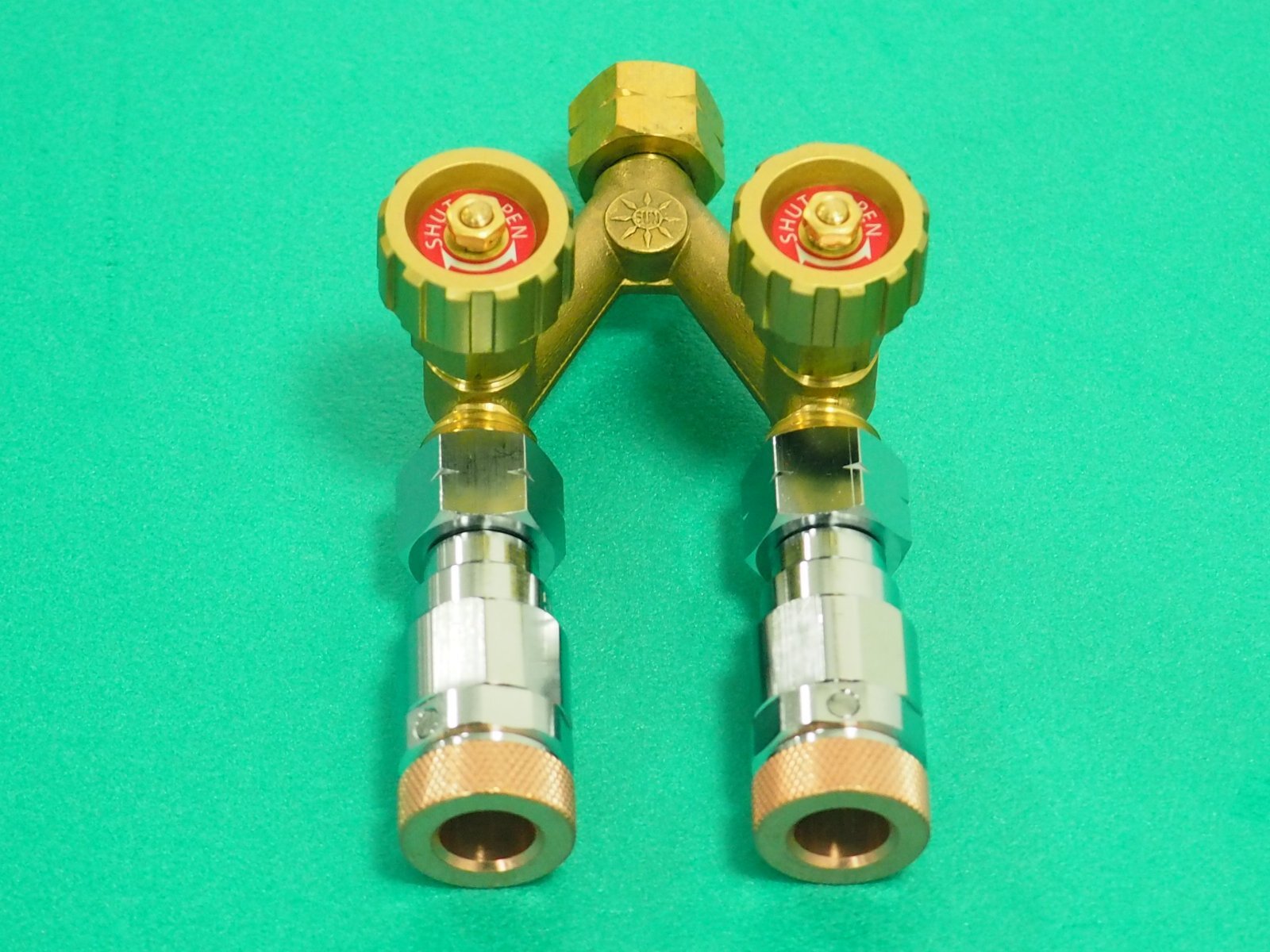 アセチレン調整器に取付ける分岐管 二又バルブワンタッチ仕様