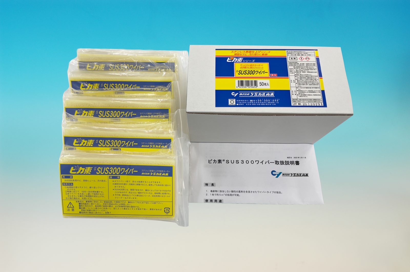 薬液を染み込ませたタオル式ワイパーで、軽いさび取り、溶接ヒュームの拭き取り、酸洗ムラのぼかしなど、気軽に拭くだけの簡単処理。出荷前のお化粧直しに最適で、ご使用後のワイパーを水洗し水切りすれば、拭き取りワイパーとしても使える丈夫な不織布です。