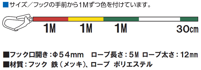 ・フック手前より1m間隔にて色付けしているので、吊り荷との距離感が一目で測れます。